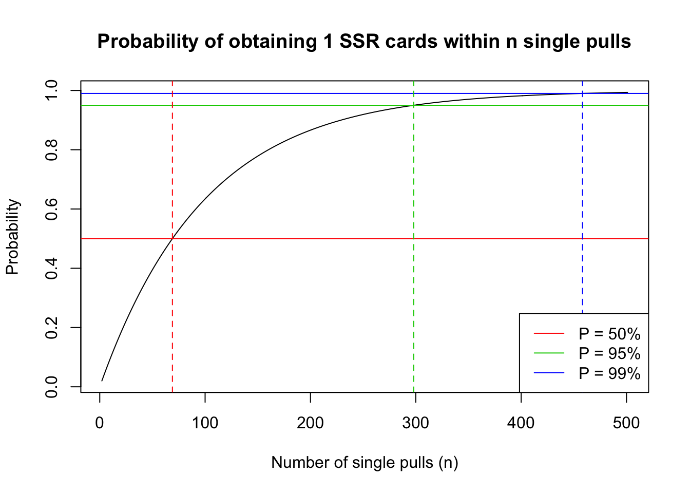 We plotted the probabilities of obtaining 1, 2, and 3 SSR cards in 1 to 500 pulls. Here we used the Fate/Grand Order Saint Quartz Summon Distribution Rate on an non-event banner. We define “success” as pulling a 5-star servant (character), and the probability is 1.000% (according to in-game statistics provided).
